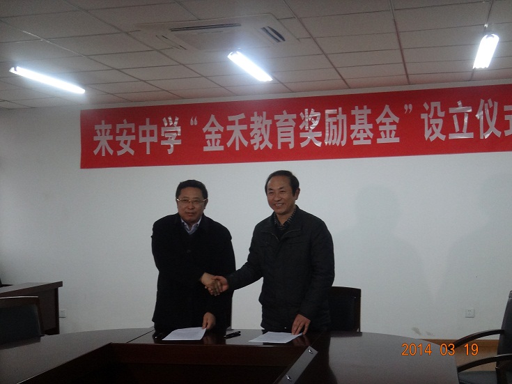 为了激励来安中学教师的教学热情和积极性,提升来安中学的教育教学质量,整体带动来安的教学质量提升,让更多的优秀学子能够到理想的高校深造,让更多的教师能够在平凡的岗位上做出应有的贡献,公司决定在来安中学设立球速体育教育奖励基金。球速体育教育奖励基金由公司一次性捐赠伍拾万元设立,主要用于高考成果奖励和教师教科研成果奖励。2014年3月19日下午,捐赠仪式在来安中学新校区正式举行,公司总经理戴世林与县政协副主席、来安中学校长袁世年共同签署了捐赠协议。