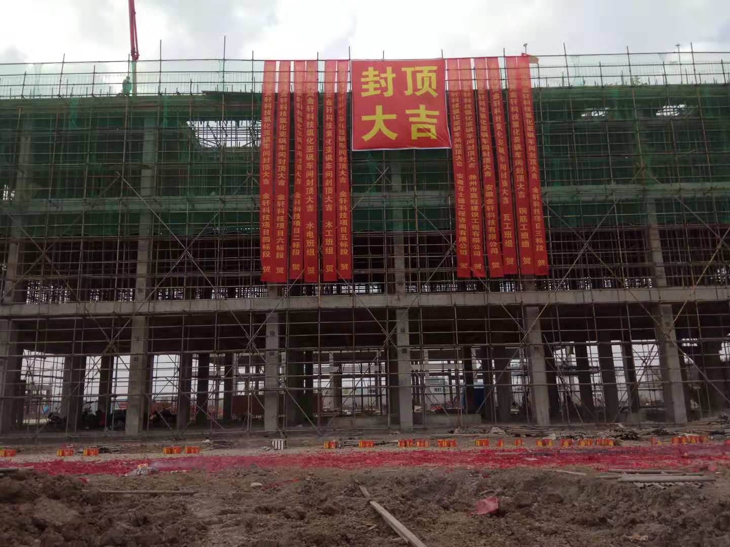 2018年11月4日上午8时18分,安徽金轩科技有限公司循环经济产业园一期项目土建工程第一标段氯化亚砜车间主厂房顺利完成封顶。