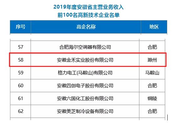 公司入围2019年安徽省主营业务收入前100名高新技术企业榜单